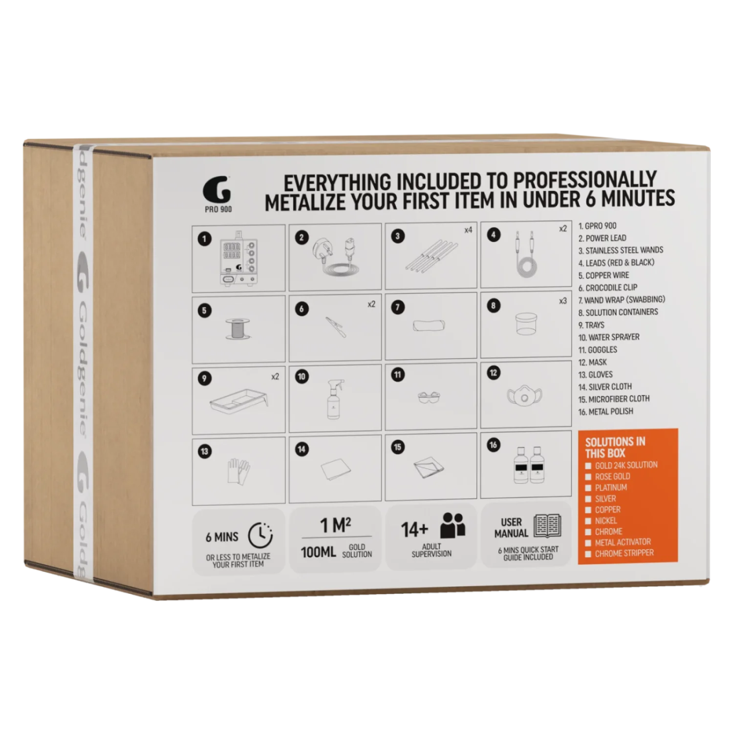 The GPRO 900 is an innovative portable gold plating system that allows its user to metalize hundreds of everyday items in a range of precious and semi-precious metals including 24k Gold and Platinum. Simple to use and understand the GPRO 900 portable metallizer comes complete with a Quickstart guide and step-by-step video tutorial that will have you plating your first item in under 6 mins.