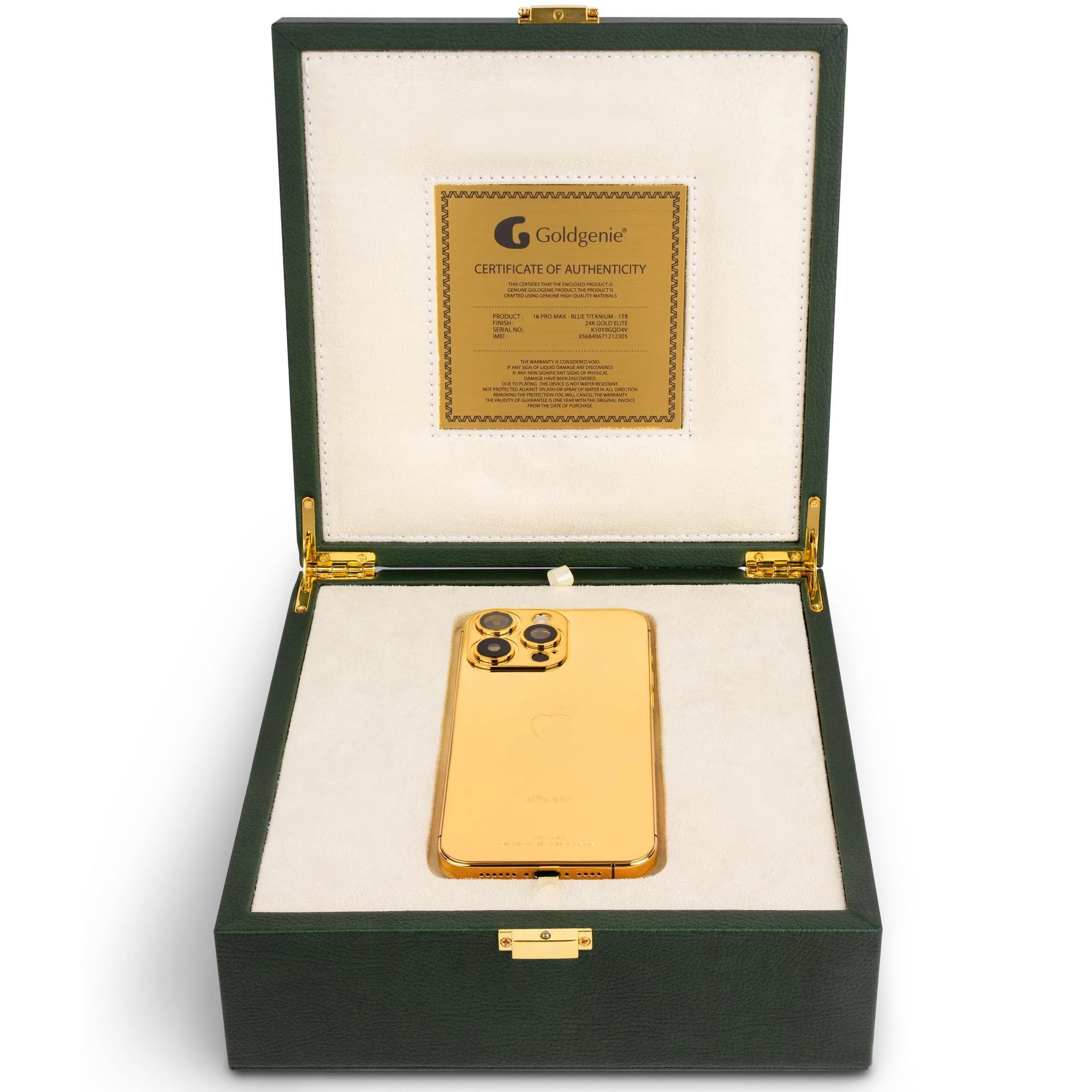 The Goldgenie iPhone 16 range includes our 24k Gold, Rose Gold, and Platinum versions to Croc-embossed leather, Swarovski crystal and VS1 Diamond encrusted variations. Please note: Wireless charging may not work on customised iPhones.